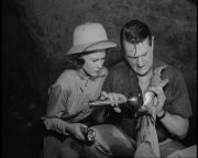 The fun begins as we open with a still shot of a barren desert. As the credits roll, somebody shines a pen-light onto the picture and moves it slowly downward...oops, sorry. I mean a UFO descends from the sky and crashes into the ground. Cut to nuclear scientist Steve March's office where he's busy doing...you Ahhh, the irony...Dan reading a Science Fiction rag while actually being in a sci-fi film. (End sarcasm.) Seriously, this is about as witty as the film gets. Enjoy it. Dan's cavalier attitude gets under Steve's skin, and hell, as Steve notes, "The Geiger counters have being going on and off all morning...and the nucli-ometer checks right along with it!"...who wouldn't be upset? I mean, faulty Geiger counters are one thing, but when the nucli-ometer starts to act up...whoa Nelly! "You're talking like a man with rocks in his head," Dan retorts, "Radioactivity is a constant thing." (Hmmm. Well, maybe around Three Mile Island, but I'd be a bit concerned if Geiger counters were 'constantly' going off the scale around my place. But then again, I've already fathered two children and I'm balding, so I guess I don't have too much to lose after all.) At this point the Geiger counter gives another burst and Dan concedes that maybe Steve has a valid point. Puzzled, Dan suggests that the source of the radiation is radon gas seepage, "or maybe a plane flying over the bombing range with an atomic warhead." Nope. Nada. Steve has pinpointed the source of the outbursts to...BUM BUM BUM!...."Mystery Mountain". "Mystery Mountain," Dan helpfully exposits, "the most God-forsaken spot on the desert. Hasn't seen a human been since nineteen-hundred when the prospectors gave it up." In strolls Steve's fiancé, Sally, who reminds the guys that they haven't eaten lunch yet. Anyway, it looks like lunch is just going to have to wait. Yup. Steve insists that he and Dan are to head out to Mystery Mountain right away so they can try to discover the cause of the radiation. But...no! Sally ain't playing dat! She's made the coals and the hamburgers are ready to eat. Those pesky bursts of lethal radiation will just have to wait until after lunch. End of conversation. In a comical continuity error, a pith helmet mysteriously appears on a table while the trio are looking at a wall map. Since the scene is all one shot, an offstage crew member must have snuck onto the set and placed the hat upon the table while the camera was aimed at the side of the room. Ahhh, opening a beer and finding continuity errors...life just doesn't get any better than this...