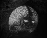 Moving right along, Steve's fiancé, Sally, is played by Joyce Meadows, an attractive actress who appeared primarily in Westerns and TV sci-fi during her nearly 40-year career. Joyce does a respectable job playing the love interest of a man whom has been taken over by a giant space brain. How you prepare for a role like that is beyond me, but she does an admirable job pulling it off. Last but not least is Sally's father played by veteran character actor Thomas Henry. Thomas has appeared in over 150 films and television programs, mostly Westerns and TV guest appearances. Much to my delight, he has popped up in some crappy monster movies including Mr. B.I.G.'s despicable Beginning of the End (1957), the vastly superior Earth vs the Flying Saucers (1956), and the entertaining 20 Million Miles to Earth (1957). (Trivial Pursuit Prep: Ray Harryhausen did the effects for both "Earth vs the Flying Saucers" and "20 Million Miles to Earth"...just so you know.) OK, I lied. Thomas Henry isn't the last in the films cast...I have obviously neglected to mention our star: the titular brain: Gor. You see Gor is bad, evil. Just plain mean. And he's horny. Not only does Gor want to take over the Universe, he wants to get a little while he's doing it. (I kinda like this guy...er, brain.) Gor takes over Steve's body and delights in the fact that he can now get his hands all over Sally. Well, they're still Steve's hands, but you know what I mean. A second brain, Vol, also arrives on Earth in order to arrest Gor for, well, trying to take over the Universe, I suppose. How will they ever stop a mad, ethereal space-brain? Read on and see!