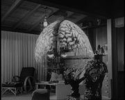 We now finally get to see Steve and Gor in the same shot. As Steve realizes the meaning of the message, he spots an axe sitting by the fireplace. Behind him, Gor hovers and gloats about his string of successes. (Gor is actually a bit of a braggart. He loves to go on and on about how he's going to rule the universe and all that. Quite a tedious space brain.) Sally, still hiding in the back room, chances upon the Sheriff's body and screams. Gor twists around on his wires, literally, and tries to head-butt Sally. (Or would this be a 'brain-butt'?) As Sally avoids Gor's battering-ram tactics, Steve leaps You really haven't lived until you've seen John Agar pounding a giant brain-shaped balloon with a rubber axe. This is the stuff of which legends are made. Once Gor is dispatched, Steve and Sally embrace. "By the way," Steve says, "How did you happen to know about the Fissure of Rolando?" "Vol," Sally says between gasps, "Oh, that's right, you don't know about Vol...He's another brain from planet Arous." Sally turns to George but is unaware that Vol has departed. "Vol," Sally says to the dog, "Tell Steve what you told me about Gor." Steve quietly shakes his head in disbelief as Sally pleads with the dog to speak. After a moment or two, Steve grabs Sally in a hug and grins, "You and your imagination..." Ha ha. Yeah, who would ever believe that, while your standing ankle-deep in Gor's minced brain matter. Final kiss and cut to closing credits. The End. Dennis Grisbeck (June 2006)
